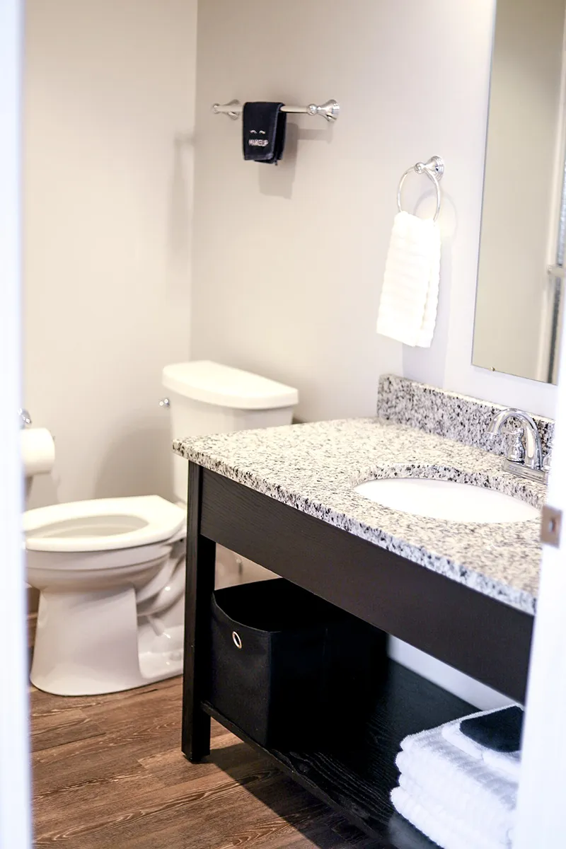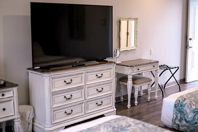 Modern amenities include a 65-inch smart TV with streaming capabilities, a two-door mini-fridge and freezer, Keurig coffee maker, USB charging alarm clock/radio, high-speed fiber optic Wi-Fi, and individual climate controls. Thoughtful details such as ironing essentials, a hairdryer, a dedicated make-up vanity with bench and magnifying mirror, a dresser with TV stand, work desk with chair, and a nightstand ensure a seamless experience.